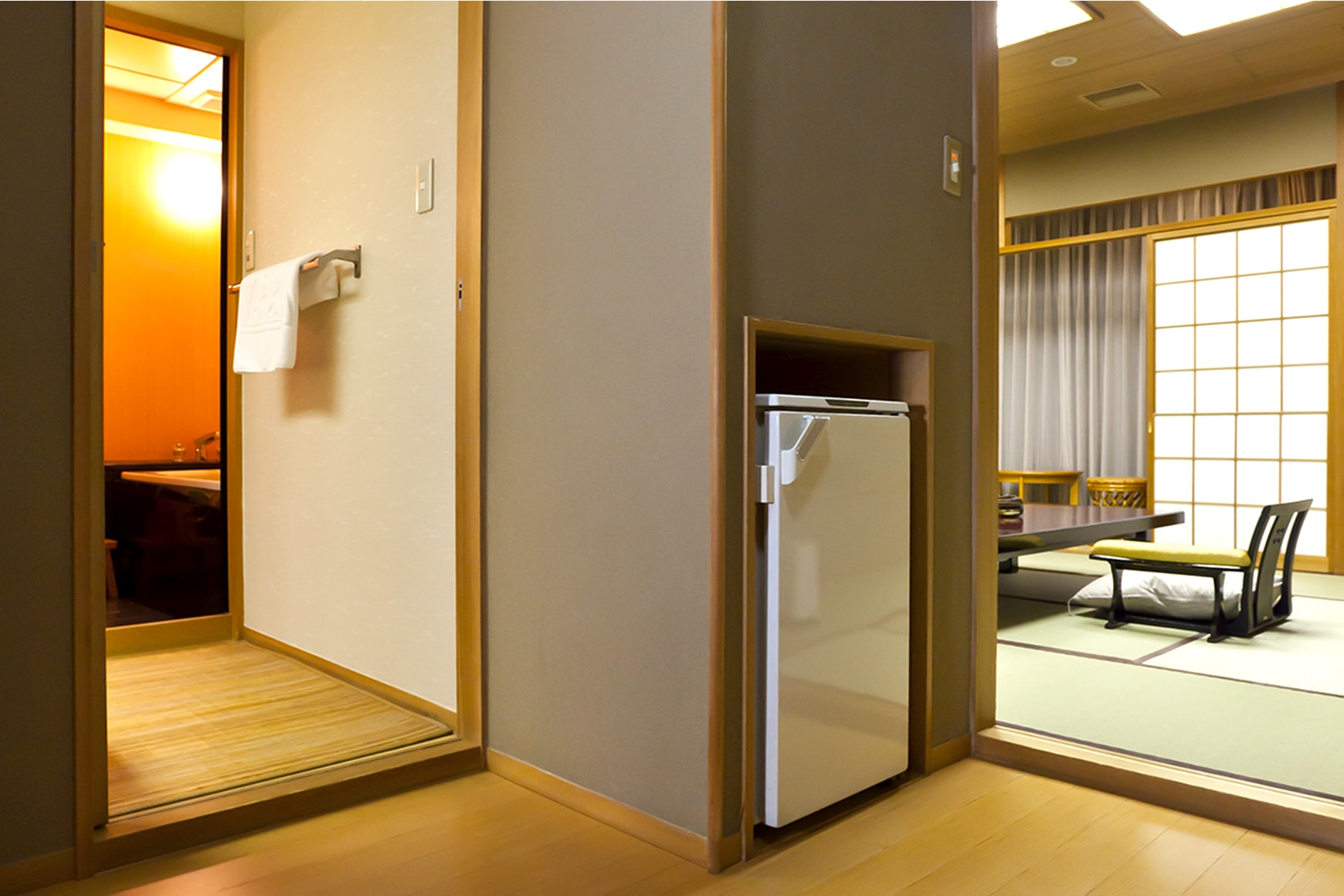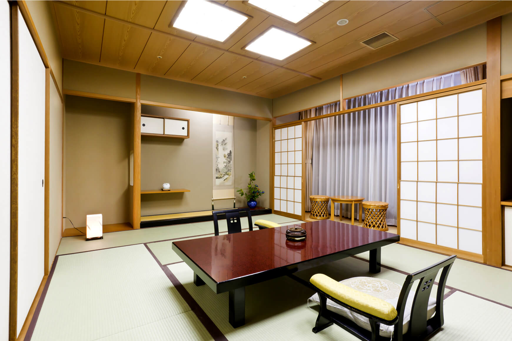 数寄屋造りの旅館のため内装は異なりますが、10.5畳の本間に踏込み、ソファーセット付の広縁、2畳から4畳の控の間が備わった、落ち着きのある客室です。