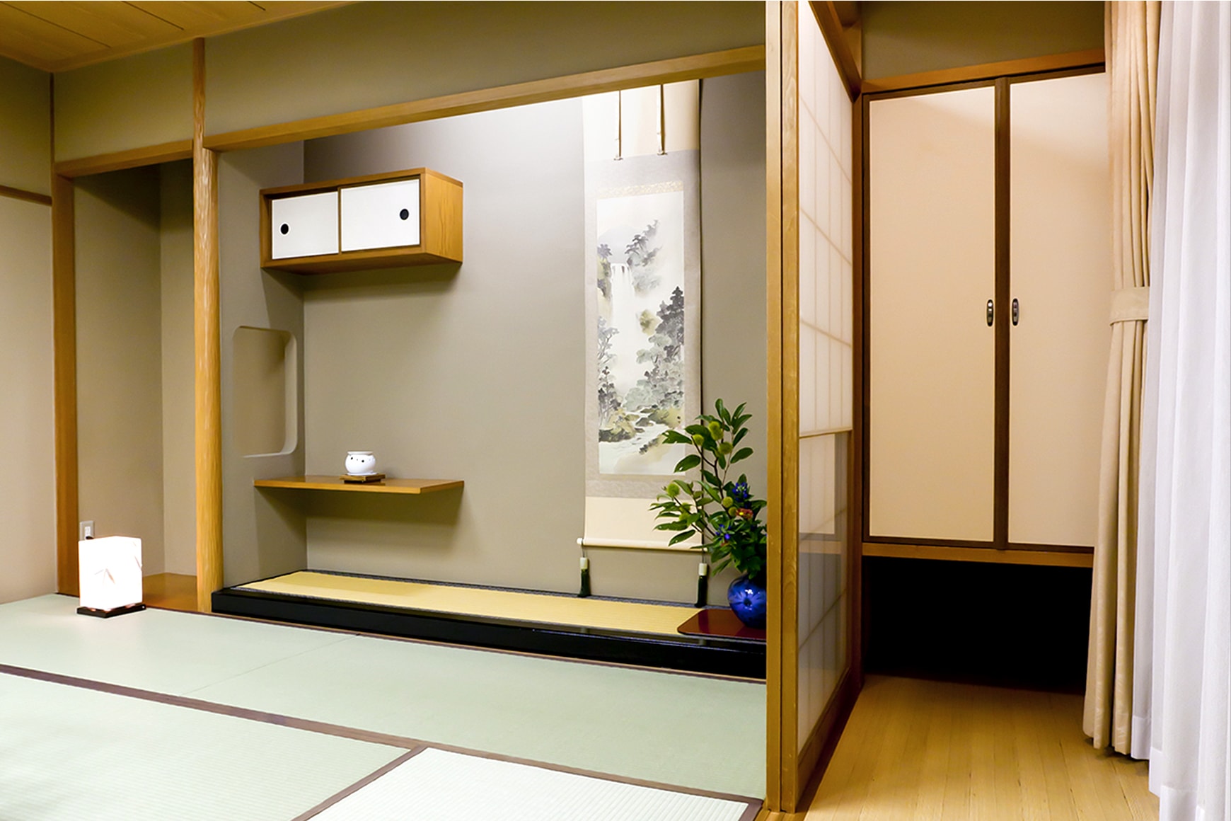 木材は国産天然無垢材を使用し、壁材は本聚楽壁で仕上げた日本建築の伝統的な10.5畳の本格和室です。